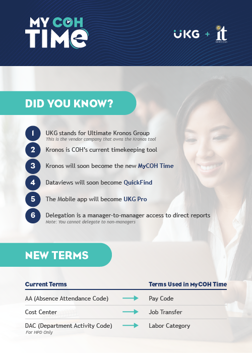 MyCOH Time Change Champions are a team of incredible individuals across COH departments who are dedicated to driving positive change for the MyCOH Time project! They are a vital part of the project team, all of whom aim to ensure project information is shared with their leadership, peers, and staff, and serve as points of contact for those who may have questions related to MyCOH Time.