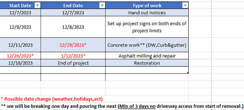 - December 11 - December 29, 2023: Intensive work on driveways, curbs, and gutters. This phase involves removing existing concrete and pouring new material, leading to a temporary loss of driveway access for at least three days from the start of removal.