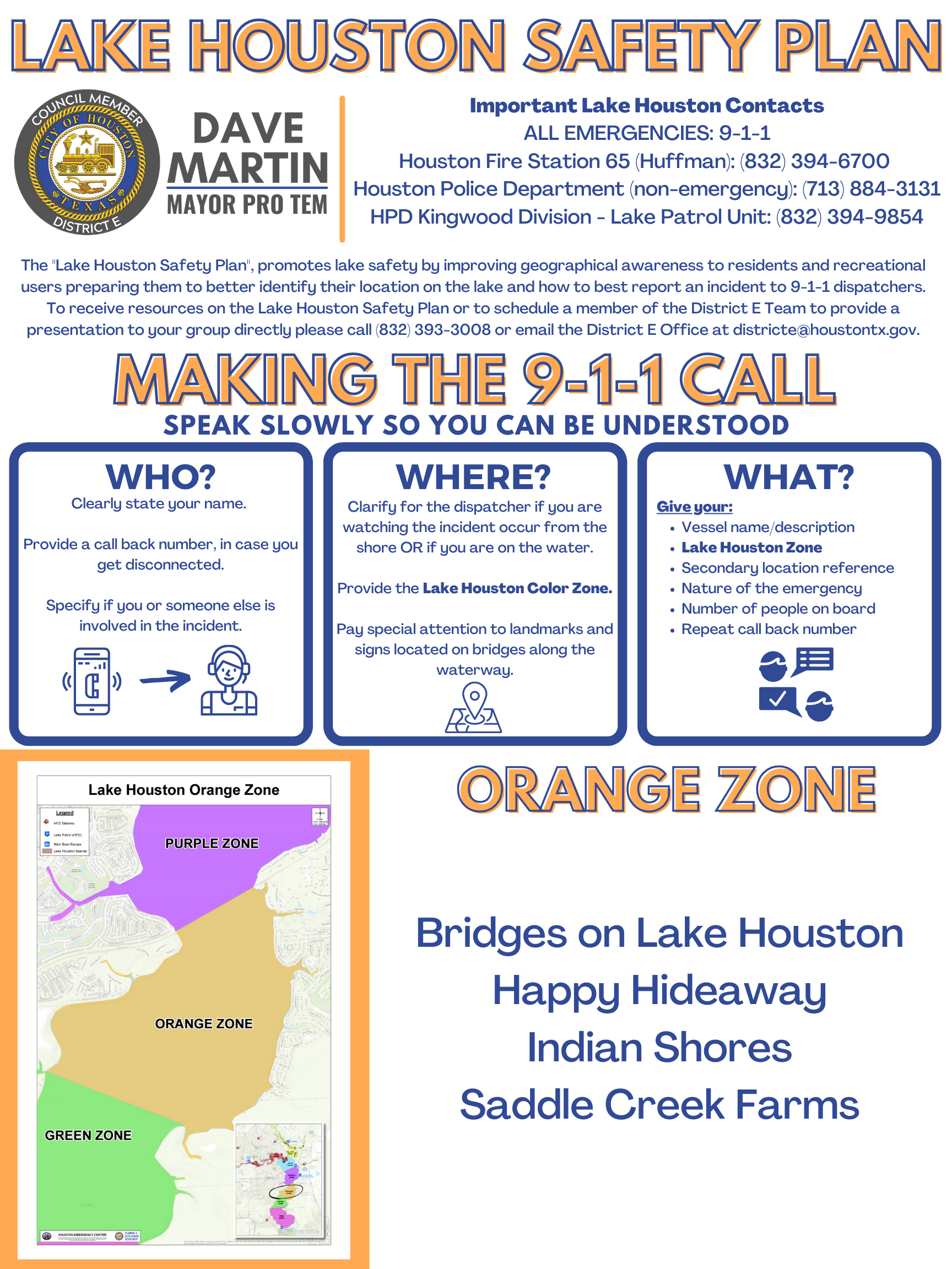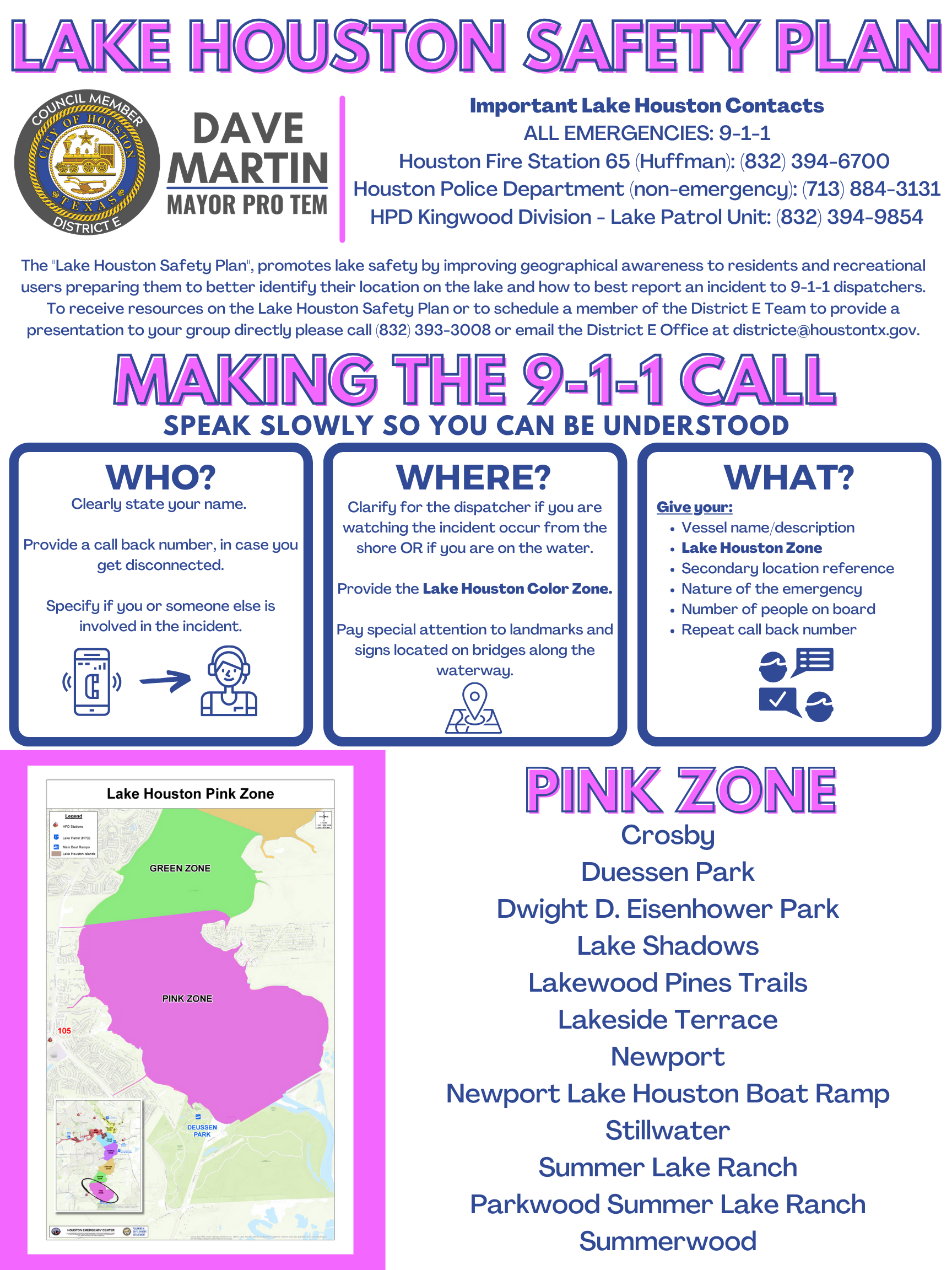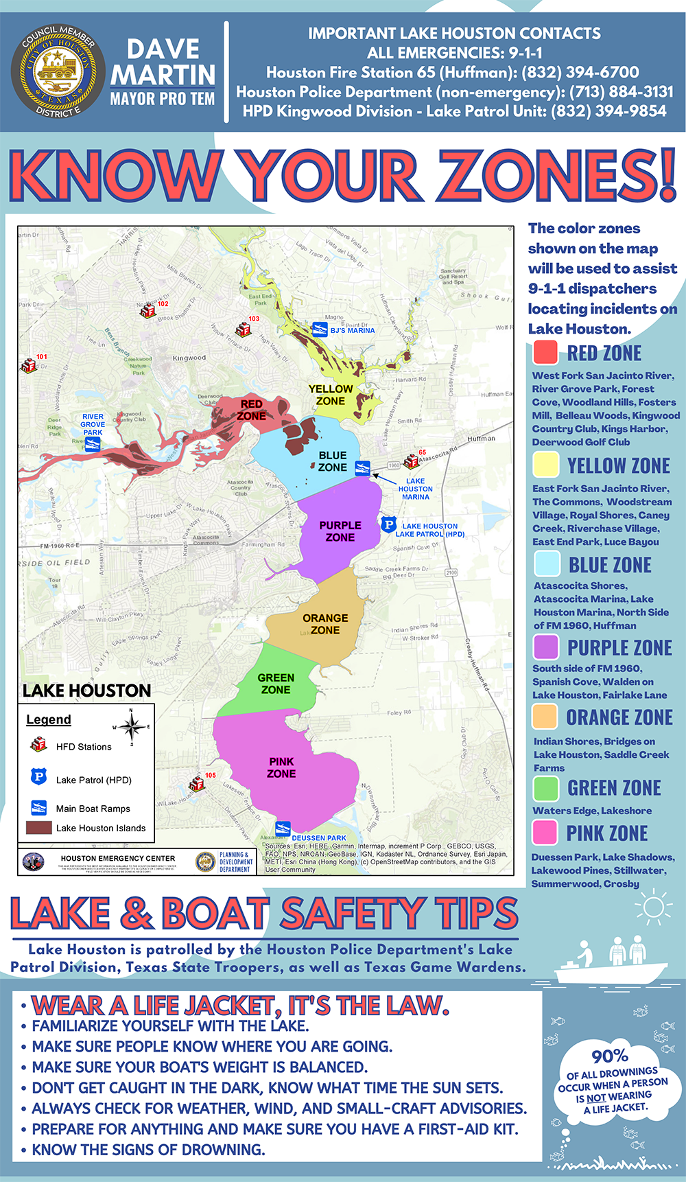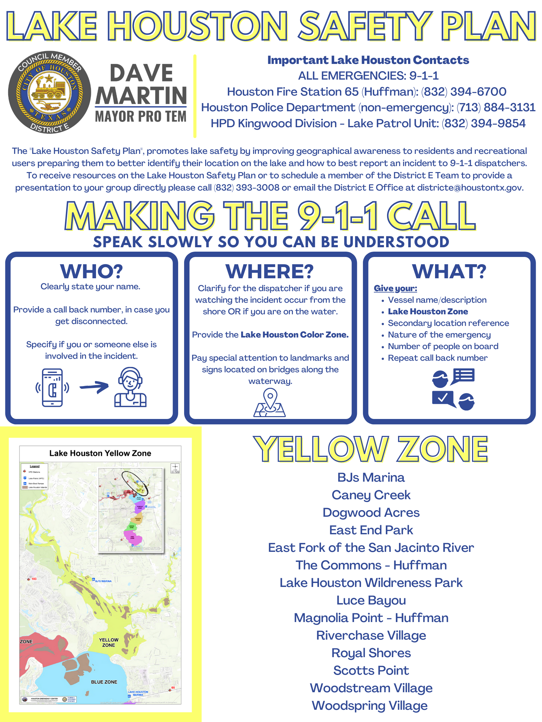 The purpose of the Lake Houston Safety Plan is to provide both Lake Houston residents and visiting recreational users with information that will prepare them to better identify their location on the lake and how to best report an incident to 9-1-1. The map was created through collaboration with the Houston Fire Department, Houston Police Department, Houston Planning Department, Houston Office of Emergency Management, Houston Emergency Center, and the Houston Public Works Department. This safety plan launched April 1, 2021.