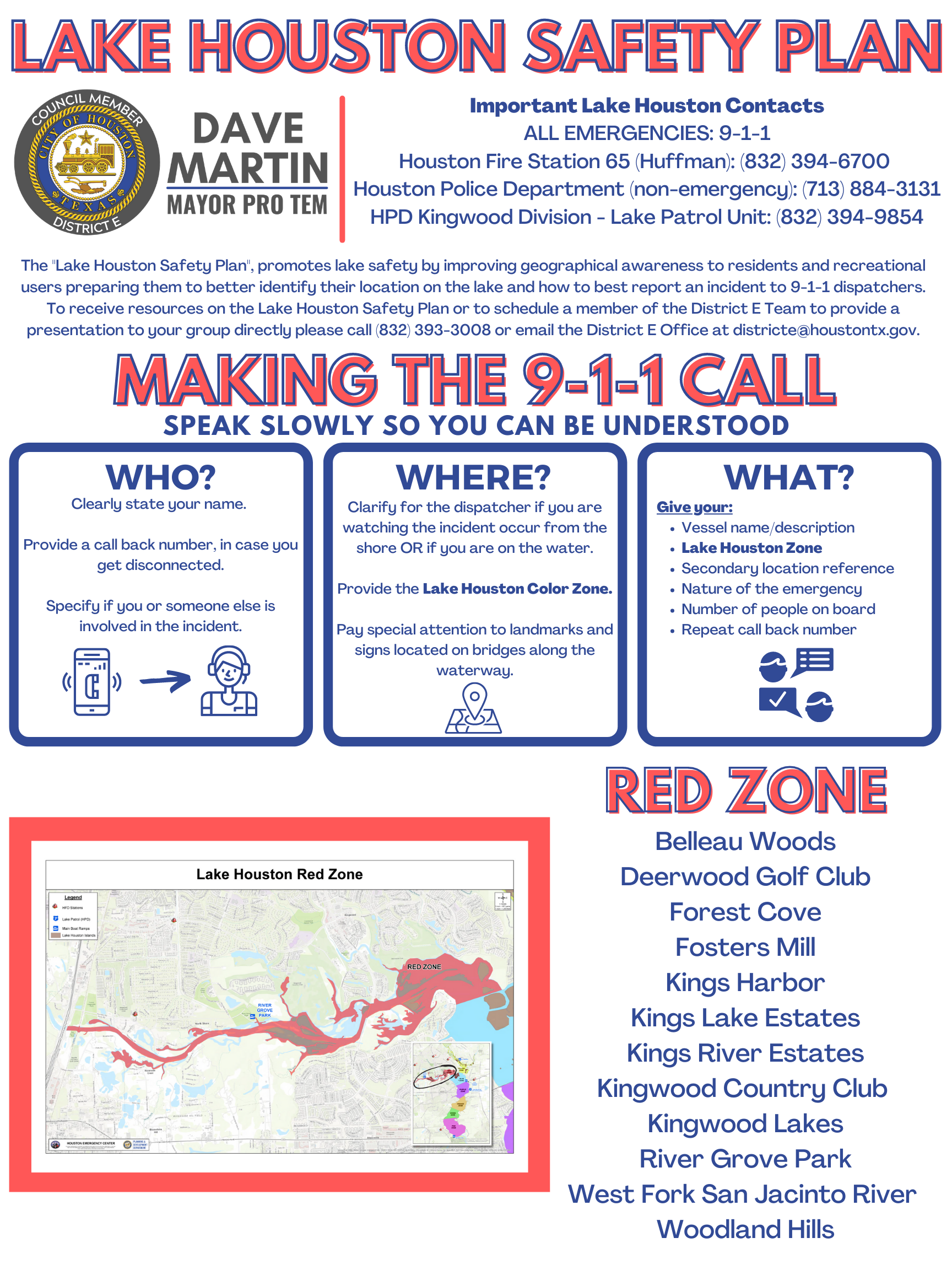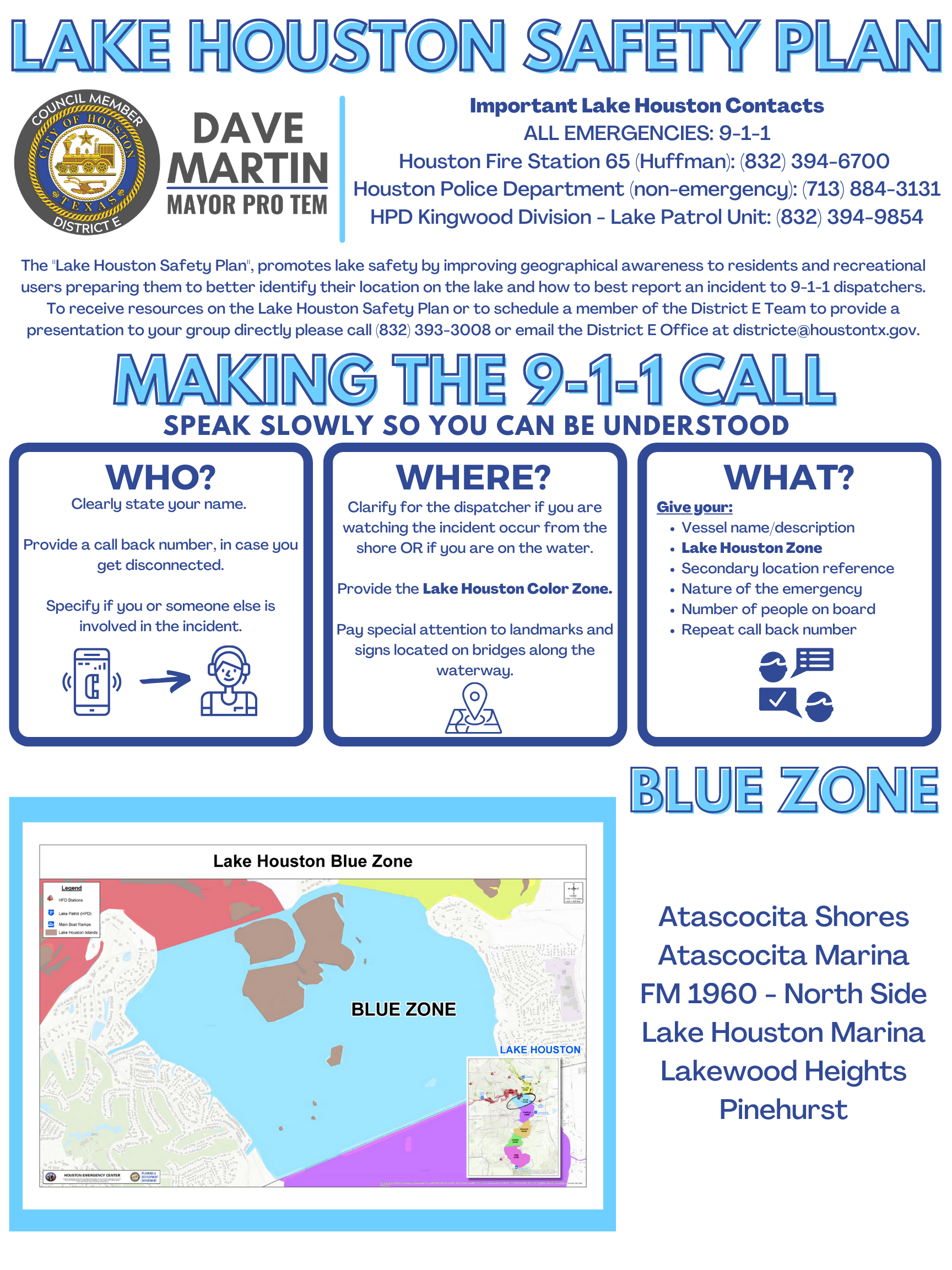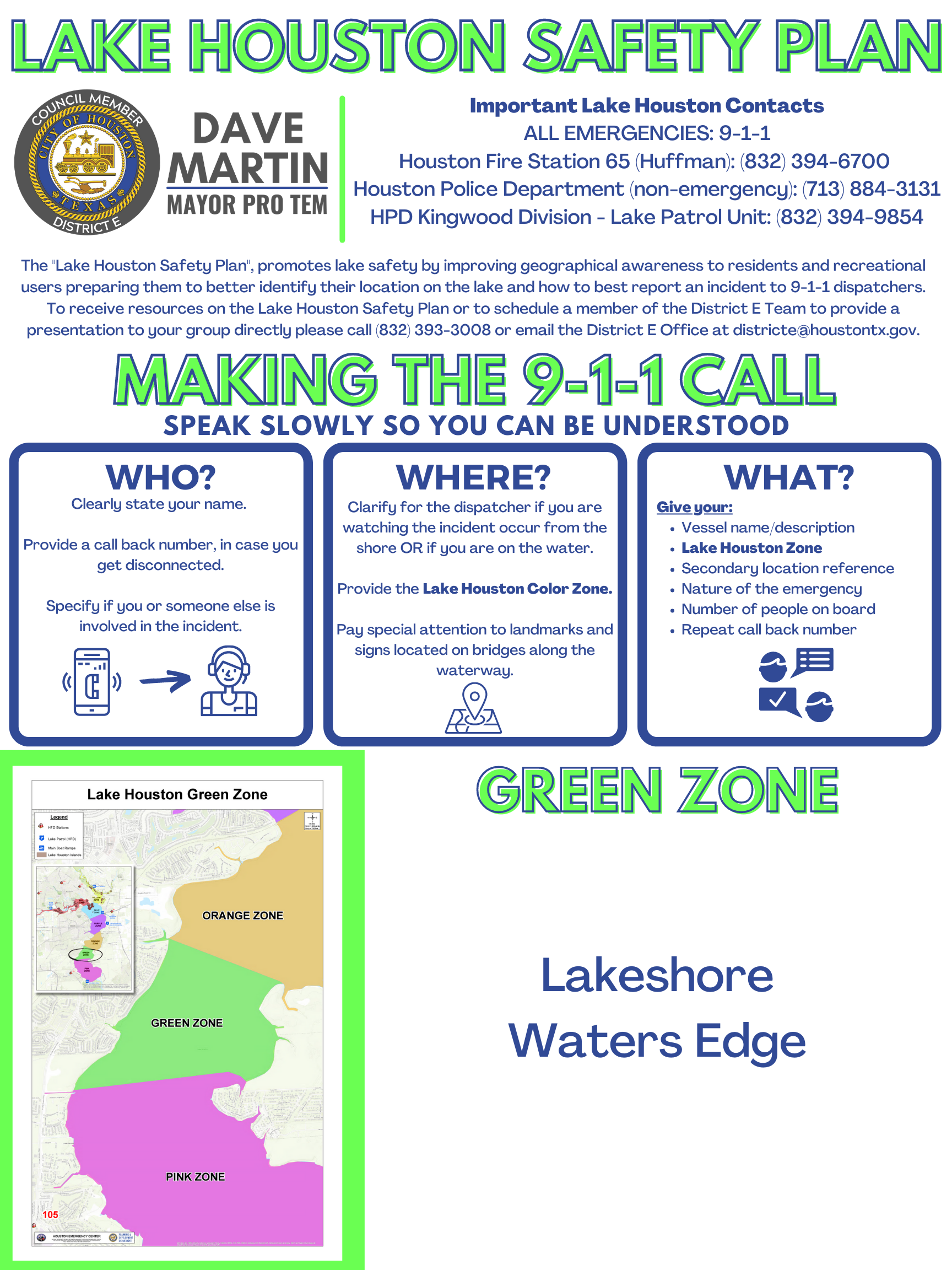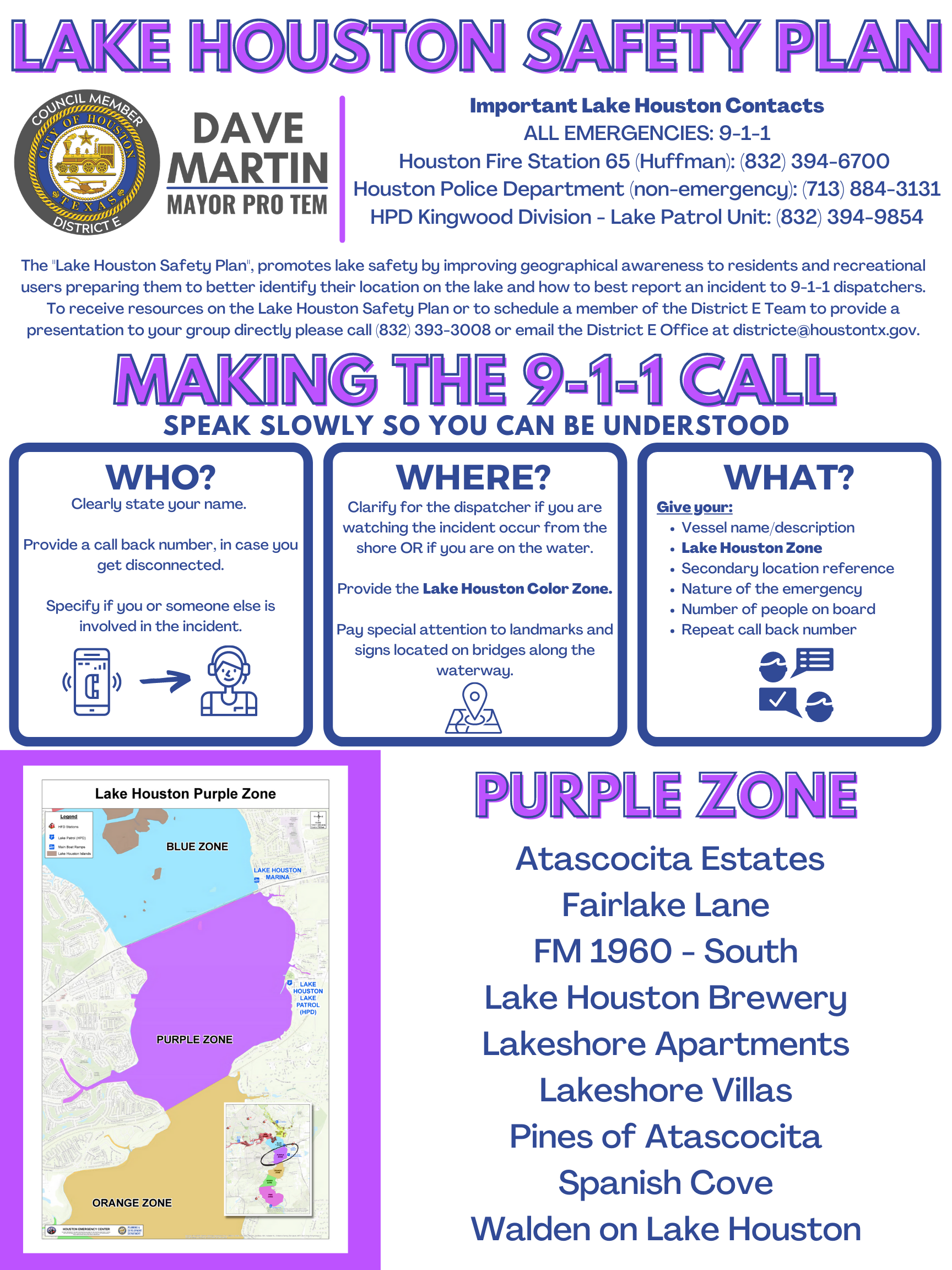 The purpose of the Lake Houston Safety Plan is to provide both Lake Houston residents and visiting recreational users with information that will prepare them to better identify their location on the lake and how to best report an incident to 9-1-1. The map was created through collaboration with the Houston Fire Department, Houston Police Department, Houston Planning Department, Houston Office of Emergency Management, Houston Emergency Center, and the Houston Public Works Department. This safety plan launched April 1, 2021.