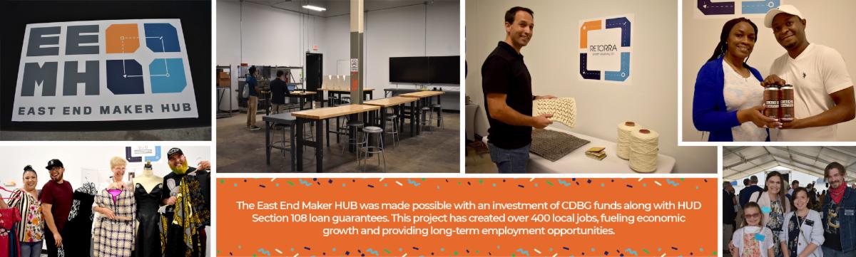 Community revitalization is at the heart of HCD’s mission, and the East End Maker HUB is a shining example of how CDBG funding can drive economic development. This project was made possible with an investment of CDBG funds along with HUD Section 108 loan guarantees. HCD played a critical role in the transformation of a 307,000-square-foot warehouse into a vibrant hub for small and medium-sized manufacturers and light industrial businesses. This rehabilitated space provides below-market rental opportunities for creative offices, studios, and shops, reinforcing the bridge between economic resilience and community revitalization.