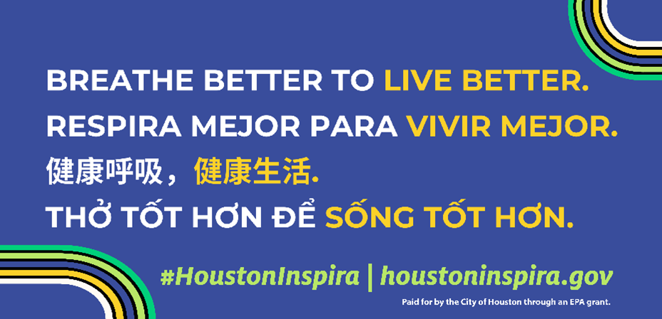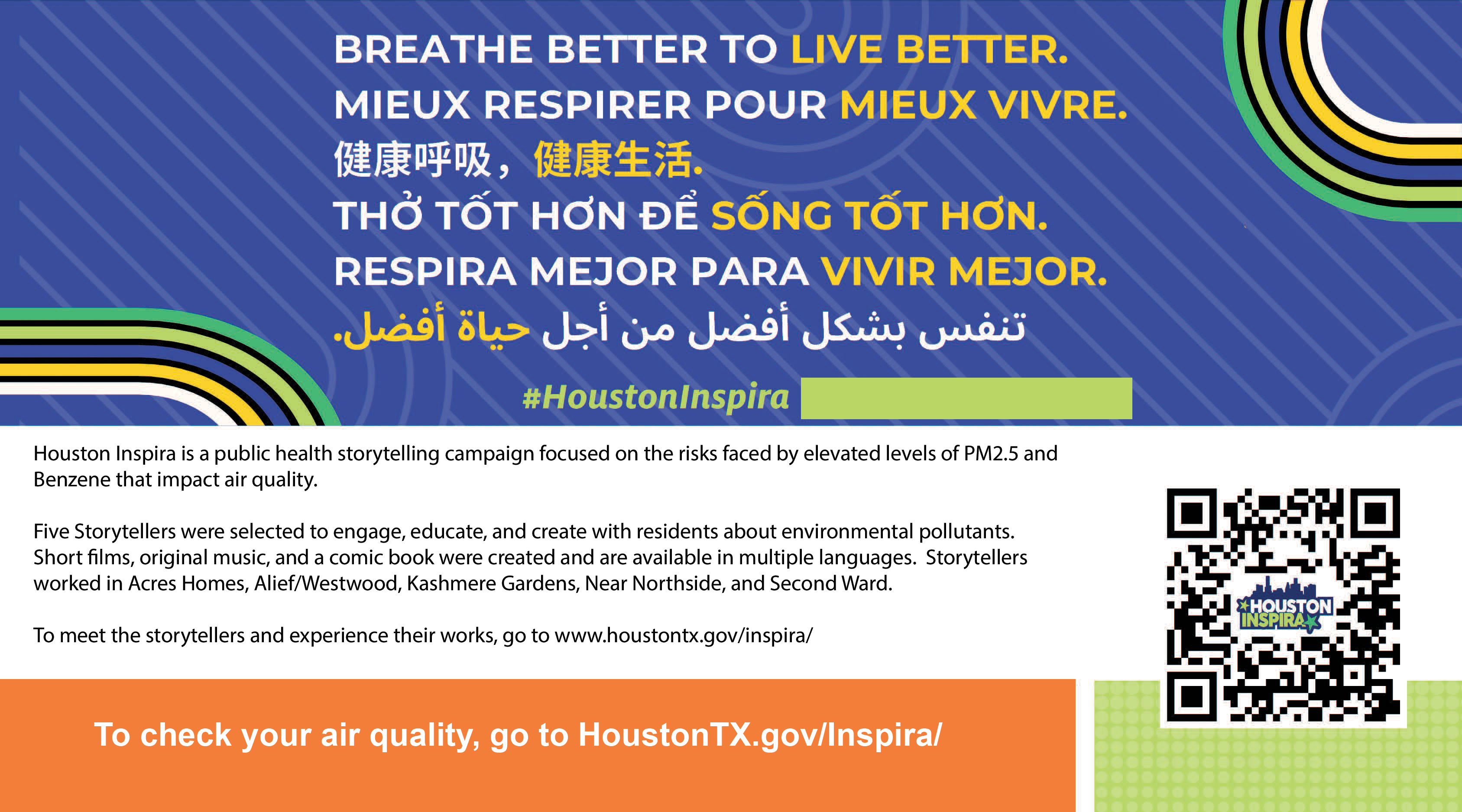 The City of Houston initiated the Houston Inspira Campaign to educate residents on the dangers of breathing PM2.5, Benzene, and other toxic emissions. The campaign consisted of billboards across the city and mailers sent to residents. Click on the graphics below for full-sized .jpg or .png versions.