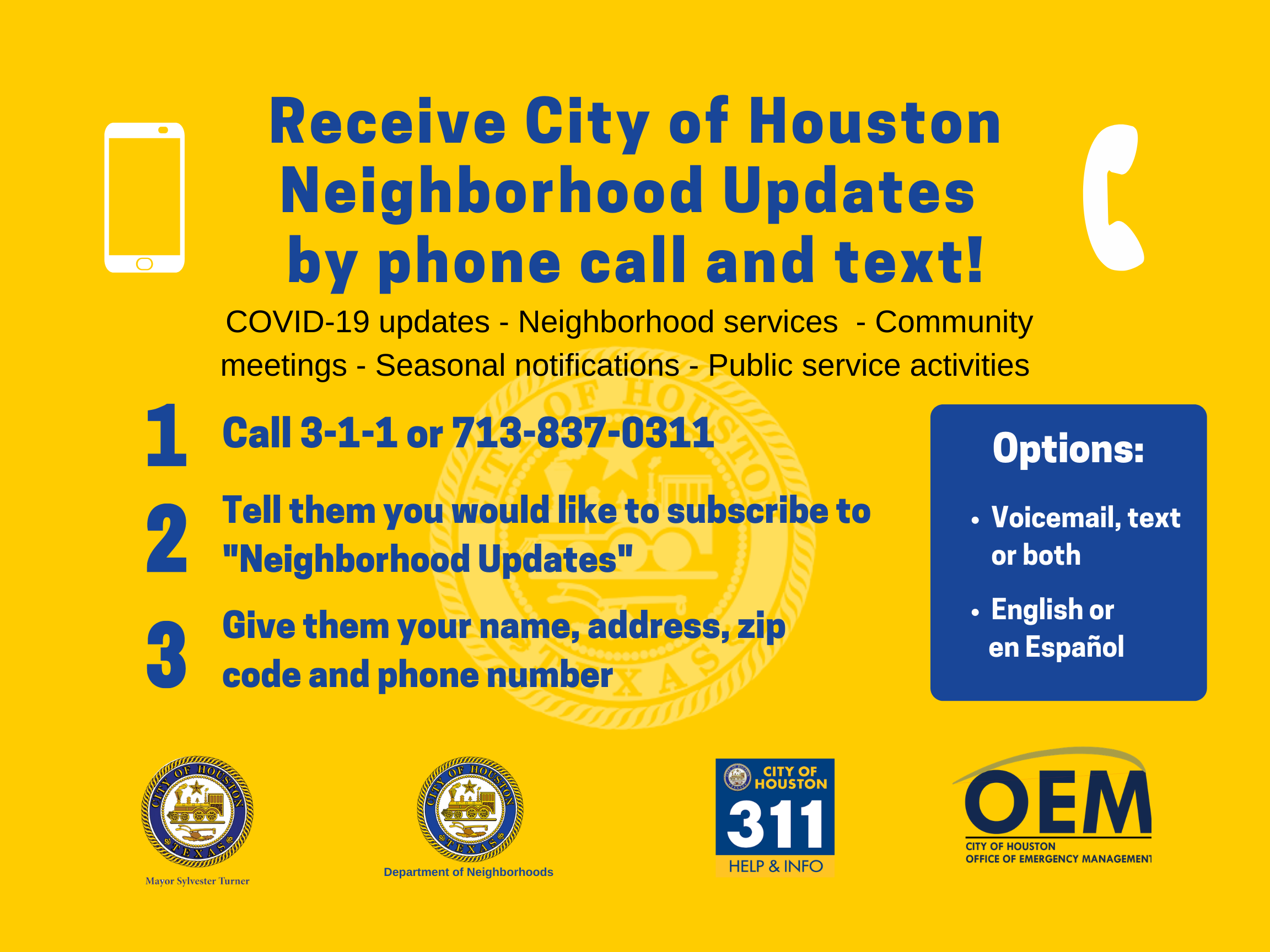 The Mayor invites residents to call 3-1-1 and sign up to receive Neighborhood Updates, automated phone messages (voice and text) in English and Spanish. This service connects those with limited or no access to the internet to essential information about City of Houston services and resources.