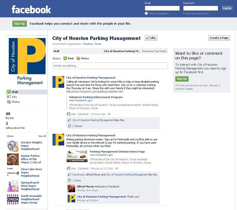 December 5, 2011 -- Do you want to know when Downtown Houston special events will impact where you can park? Need a quick response to a parking question? Would you like a reminder to renew your Residential Parking Permit? What about changes to the City of Houston’s Parking regulations? Houston Parking Management will pull into a Facebook space on Monday, December 5th.