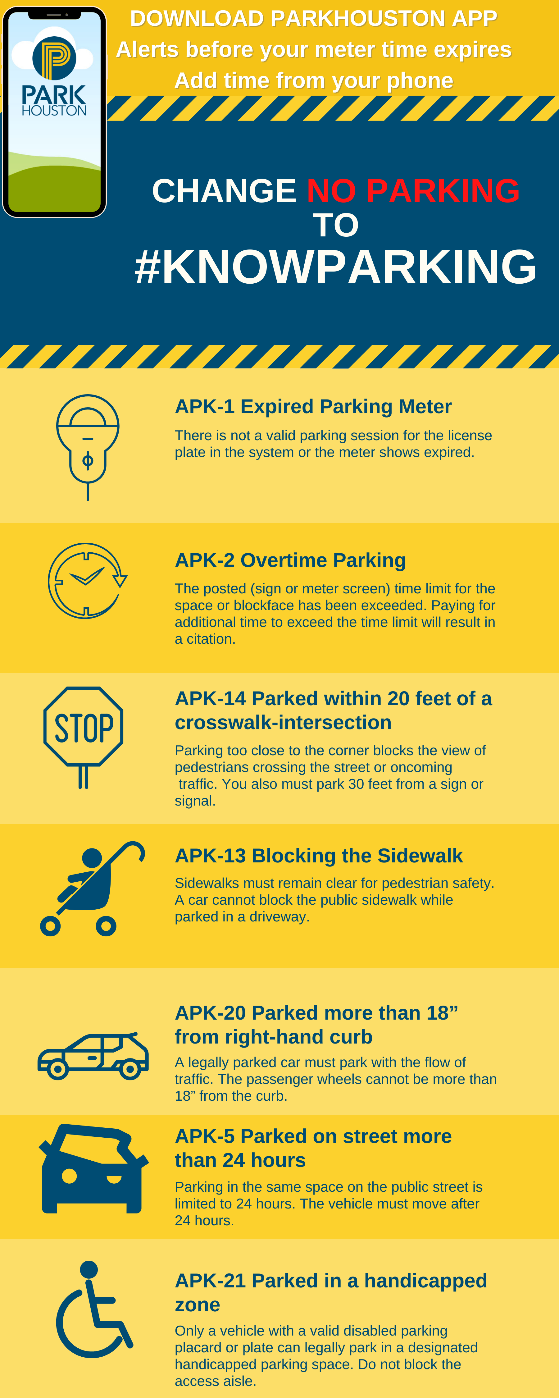 Signage is not normally posted for parking regulations included in the Texas Transportation Code, Chapter 545. They are also provided in the Texas Department of Public Safety Driver’s Handbook.