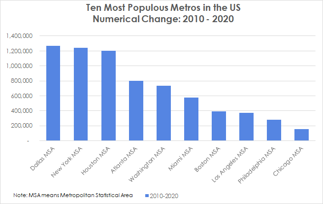 • Ten Most Populous Metros in the US Numerical Change from 2010 to 2020