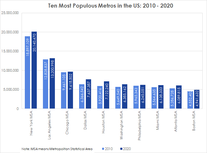 • Ten Most Populous Metros in the US from 2010 to 2020