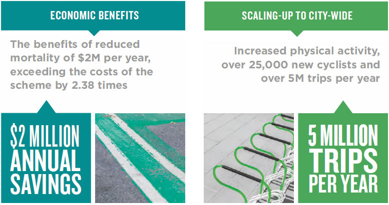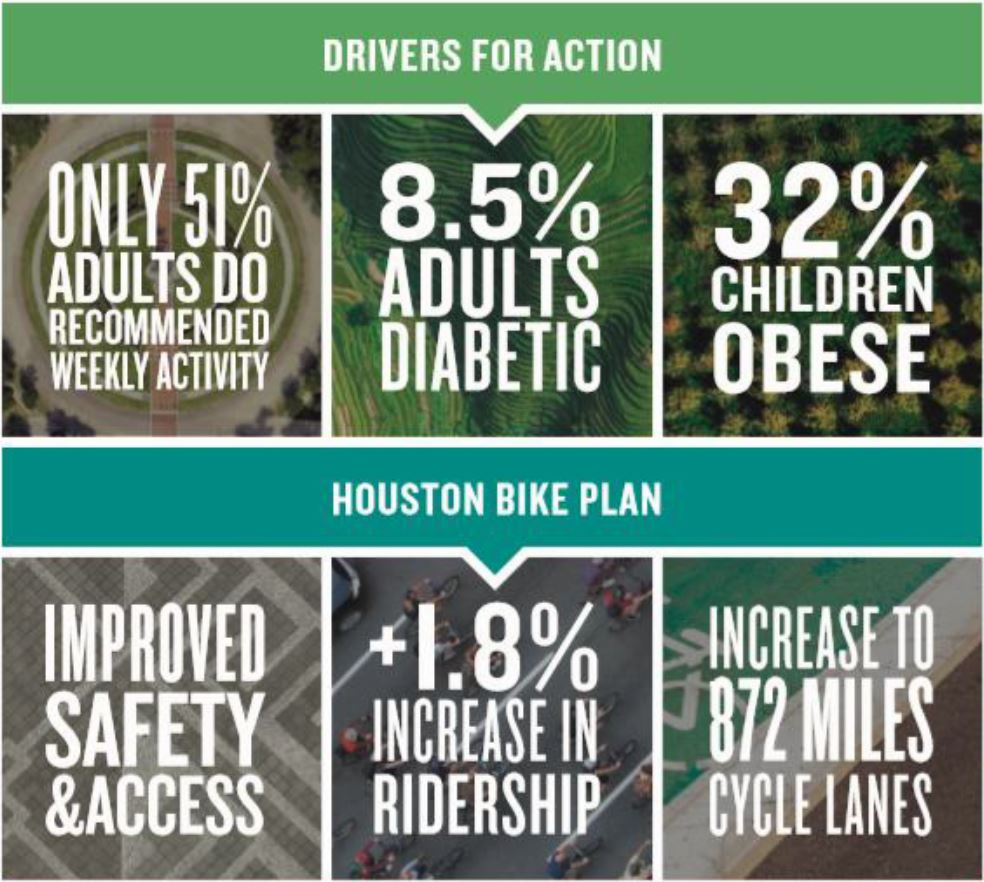 Guided by the mission the Houston Bike Plan, the report identified the ways in which a safer and more connected bike and pedestrian network encourages more people to engage in active transportation. An increase in active transportation can potentially reduce the rate of obesity, diabetes, and other health-related problems and costs, and help the city to achieve savings in transport-related greenhouse gas emissions.