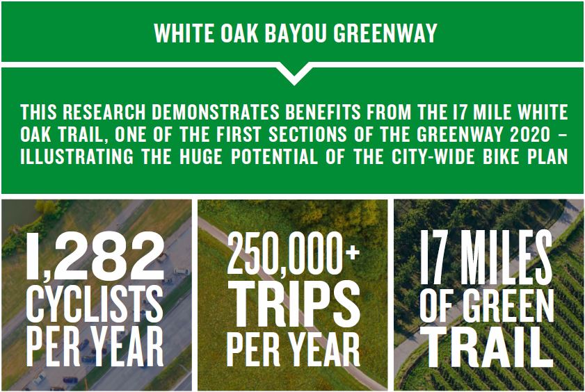 The City of Houston is participating in this research with C40 to inform the future development of similar biking and Bayou trail projects and has chosen White Oak Bayou Greenway because of its rich data about users. For example, number of users per year is 1,282 and it is estimated that 705 of those users are new to cycling. White Oak Bayou Greenway is an off-street hike and bike trail within the city limits and is located away from main highways, offering a pathway that feels safe for all users, not just the avid cyclist. The White Oak Bayou Greenway offers the opportunity to analyze detailed data on health, economic, and environmental benefits and the City of Houston has pulled from the report some initial findings: