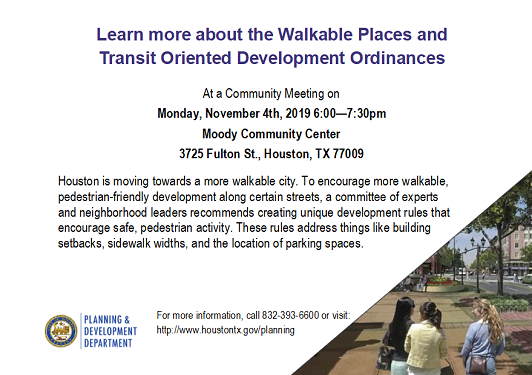 The Near Northside was selected as a pilot area for Walkable Places due to its close geographic location to downtown and to accelerate the action plan for Complete Communities. The boundary encompasses the length of Hogan/Lorraine, from Keene to Maury. The district boundary was chosen as an opportunity to connect all the incoming improvement plans created for Near Northside including the Bike Plan, Capital Improvement Projects (CIP), Transit Corridor and Hardy Toll Road. Working with the management district, the community and local stakeholders, Walkable Places will help the community become more walkable by creating development regulations that will ensure development occurring within the boundary creates a comfortable and welcoming transition from one place to another, encourages walking, and multimodal transportation use to create a Walkable Places district an experience unto itself.