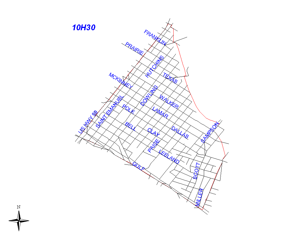 The boundary begins at the Eastex Freeway (Highway 59) and the south side of Canal and follows Canal a few feeet to the MKTMP railroad tracks. Canal is the responsibility of 10H10's beat. The boundary follows the railroad tracks south to Sampson, and continues south on Sampson about a block to the HB&T railroad tracks. Sampson is the responsibility of 10H30. It turns south along the HB&T railroad tracks to Milby. The boundary continues south on Milby to the Gulf Freeway. Milby is the responsibility of 10H30. The boundary turns northwest on the Gulf Freeway to Eastex Freeway. The Gulf Freeway is the responsibility of 10H30. It turns northeast on the Eastex Freeway to the intersection with Canal. The Eastex Freeway is the responsibility of 1A10's beat.