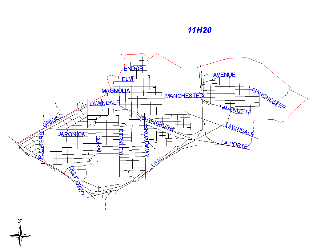 The boundary begins at the intersection of the Houston Ship Channel and Brays Bayou. It goes east along the middle of the Houston Ship Channel to Sims Bayou. The boundary follows Sims Bayou as it travels under the La Porte Freeway. As the bayou and freeway separate, the boundary follows the La Porte Freeway to the inersection of the South Loop East. It follows the South Loop East to the Gulf Freeway (I-45.) The La Porte Freeway, South Loop East, Gulf Freeway, and their respective feeder roads will be the responsibility of 11H20. The boundary follows the Gulf Freeway north to the intersection with the HB&T railroad tracks. It then turns east and follows the HB&T railroad tracks that parallel Griggs Road. At the intersection of the HB&T railroad tracks Brays Bayou, the boundary follows Brays Bayou as it winds its way back to the Houston Ship Channel.