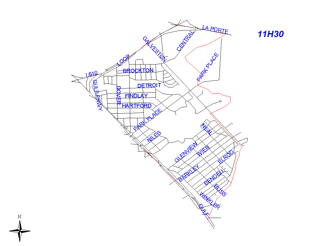 The boundary begins at the intersection of the Gulf Freeway and the South Loop East. It goes east along South Loop East to the intersection with the La Porte Freeway. It continues east on the La Porte Freeway to the point where Sims Bayou runs underneath the La Porte Freeway. The boundary then follows Sims Bayou west and south to the MKT railroad that runs parallel to Old Galveston Road. The boundary runs southeast along the MKT railroad to its intersection with Berry Creek. The railroad tracks will be the responsibility of 11H40. The boundary then follows Berry Creek southwest to the Gulf Freeway. It follows the Gulf Freeway northwest to the intersection with the South Loop. The Gulf Freeway is the responsibility of 11H30.