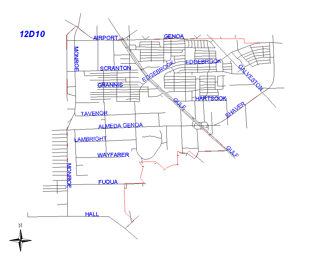 Beginning at the intersection of West Monroe Road and Airport Boulevard, the boundary goes easst to Gulf Freeway and continues east of the Gulf freeway on College to the city limits of Houston and South Houston. Airport Boulevard and College are not the responsiblility of 12D10's beat. Airport Boulevard is the responsiblityof 13D20 and College is the responsibility of 11D50. It turns south at the intersection of College and EAst Haven Boulevard and follws the city limits along East Haven Boulevard to Marleen. The boundary turns east and follows the city limits along Marleen to Pearlhall. It turns south and follows the city limits along Pearlhall to Edgebrook. It turns east and follows the city limits south along Shaver. The boundary continues to follow Shaver as Shaver winds east to the Gulf Fwy. It turns south east along the east service road of the Gulf Freeway. It turns southeast along the east service road ofthe Gulf Freeway to the intersection with Kingspoint. Therefore, the Gulf Freeway will be the responsibility of 12D10's. The boundary continues west along Kingspoint to Torrington. Kingspoint will be the responsiblity of 12D20's beat. It then turns northwest and follows the lot lines on the northeast side of Torrington. Torrington will be the responsiblity of 12D20's beat. It turns south and follows the lot lines on the west side of Alta Loma Way to a straight line from Goya to Fonville. Alta Loma Way is the responsiblity of 12D20's beat. The boundary continues southwest on Goya to Mango. It turns northwest and follows the lot lines on the northeast side of Mango until Mango turns straight west and Fonville continues on the north of Mango. The beat boundary takes in the addresses of Fonville, following the lot lines on the north of Fonville where it turns west to Stover. Mango and Fonville is the responsiblity of 12D20's beat. At Stover, it turn south and follows the Almeda Genoa Drainage Ditch on the west side of the Stover street lines. The boundary follows the Almeda Genoa Drainage Ditch to Fuqua. It turns south and follows the lot lines on the west side of Blackhawk to Kingspoint. It turns southwest and follows Kingspoint to Hall. Kingspoint is the responsiblity of 12D20's beat. It follows Hall west to Monroe Road. The boundary turns north on Monroe Road to West Monroe Road and continues north on West Monroe Road to the intersection with Airport Boulevard. Monroe Road and West Monroe Road are the responsiblity of 13D30 and 13D40.