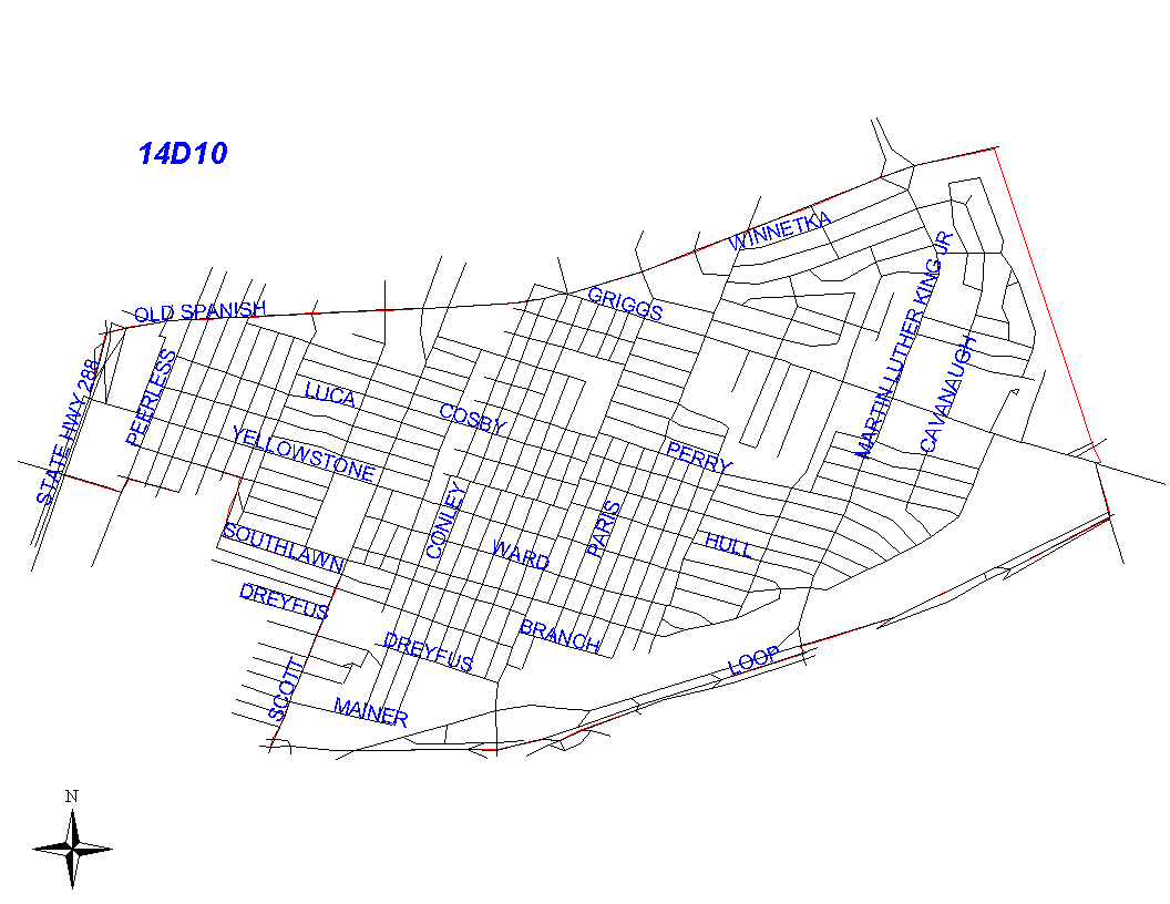 The boundary begins at the intersection of Old Spanish Trail and South Freeway (Highway 288) and goes east on Old Spanish Trail to the H.B. and T. Railroad. Old Spanish Trail is in 14D10's beat. It turns south at the H.B. and T. Railroad tracks to the South Loop. It turns west on the South Loop and goes to Scott Street. The South Loop is in the jurisdiction of 14D10. The boundary turns north and goes to Southlawn. Scott street is the responsibility of 14D20's beat. At Southlawn, the boundary turns west to Winton, north on Winton to Ward, west on Ward to Lozier, South on Lozier to Idaho, west on Idaho to Del Rio, south on Del Rio to streets are the jurisdiction of 14D10. The boundary goes north on the South Freeway to Old Spanish Trail where it begins. The South Freeway is the responsibility of 14D10. The boundary goes north on the South Freeway to Old Spanish Trail where it begins. The South Freeway is the responsibility of 14D10's beat.