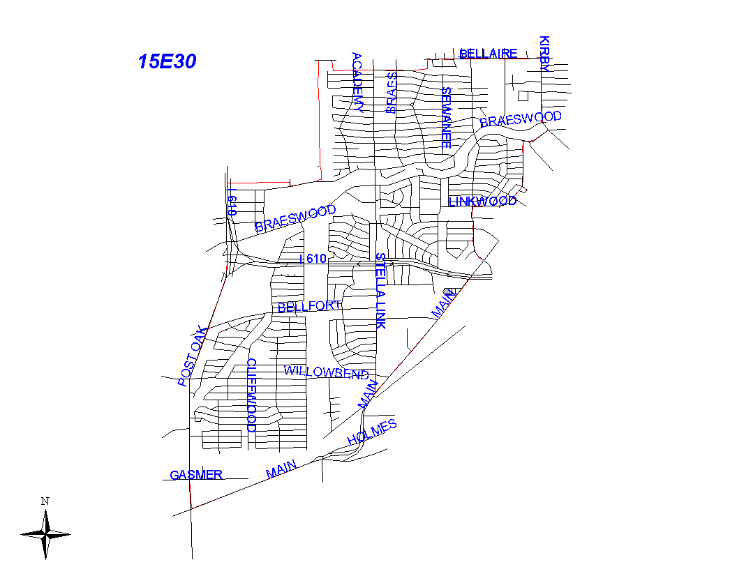 The boundary begins at the intersection of the 610 Loop West and the Bellaire City Limits at Beechnut and follows the city limits east along Beechnut to the SPRR railroad tracks, north along the tracks to Bellaire Boulevard, and east along Bellaire Boulevard to Southside Place City Limits, then south, east, and north following Southside Place City Limits to West University City Limits at Bellaire Boulevard (to exclude the Shell Research - Grammercy), then east on Bellaire Boulevard to Kirby. At Kirby, the beat boundary turns south and goes along the east lot lines to Braes Bayou. It follows the bayou to Lorrie. It turns south along the east lot lines of Lorrie and goes to Bluegate Court. It goes east, south, and west around the north, east, and south lot lines of Lorrie and Linkwood to Buffalo Speedway. It also takes in the Cul De Sac southeast off Lorrie. The beat boundary continues south along the east lot lines of Buffalo Speedway to South Main. It goes southwest along the southeast lot lines of South Main to South Post Oak. The boundary turns nroth along the east lot lines of South Post Oak to the 610 Loop West. It continues north along the east feeder road of the Loop to the intersection of the 610 Loop West and Bellaire City Limits, which is where it begins.