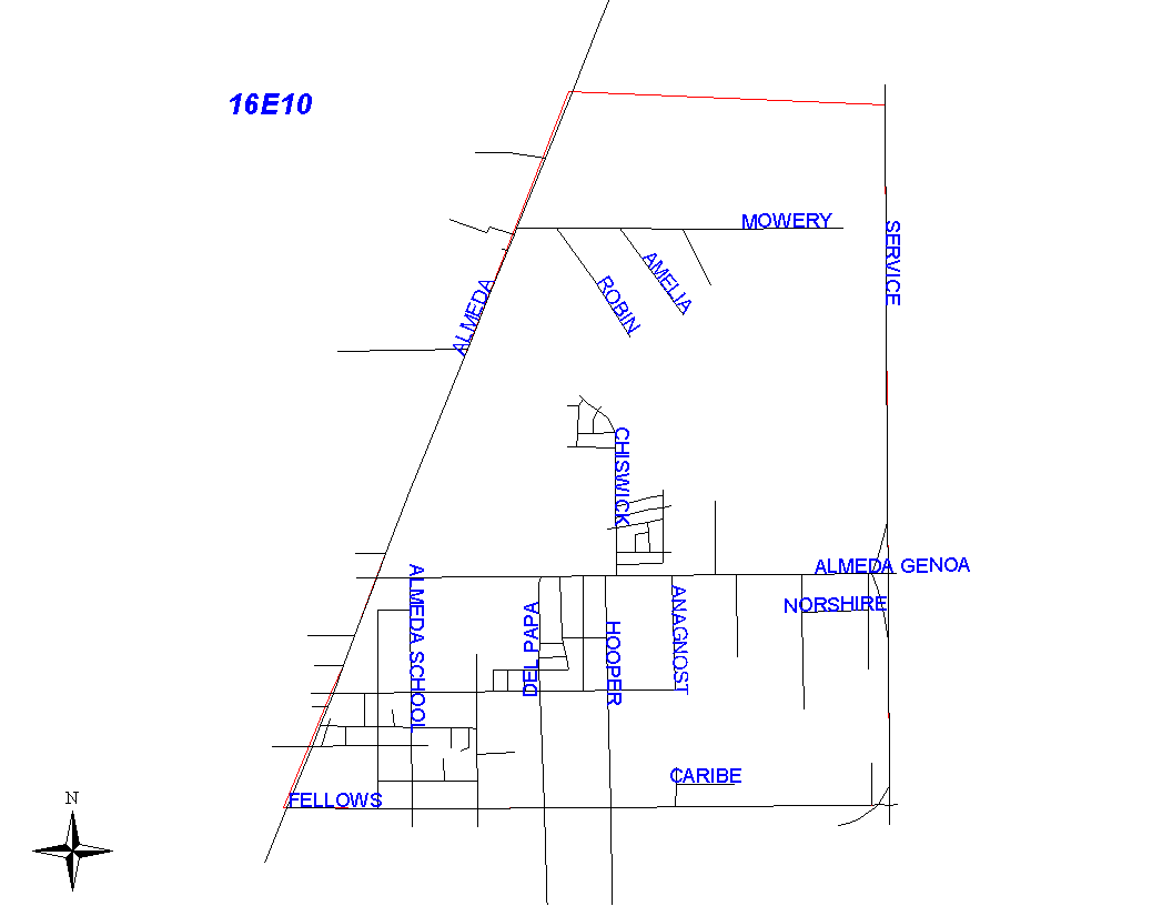 The boundary begins at a point on Almeda Road about one half mile north of Clover Lane and one mile south of Reed Road. This point is on a line from the T-intersection of Airport Boulevard and South Freeway (State Highway 288), and the intersection of Hiram Clarke and South Main. The beat boundary begins at this point and follows the line through the open space east to the inersection of Airport Boulevard and South Freeway. At that intersection, the beat boundary turns south along the west side of the South Freeway and goes to Houston City Limits that run along Fellows. The South Freeway and east feeder road are the responsibility of 14 District. The beat boundary follows the city limits west along Fellows to Almeda Road. Both boundaries turn north along Almeda Road for about one half mile. When the city limits turn west off of Almeda Road, the beat boundary continues north along the west lot lines of Almeda Road to the point of origin.