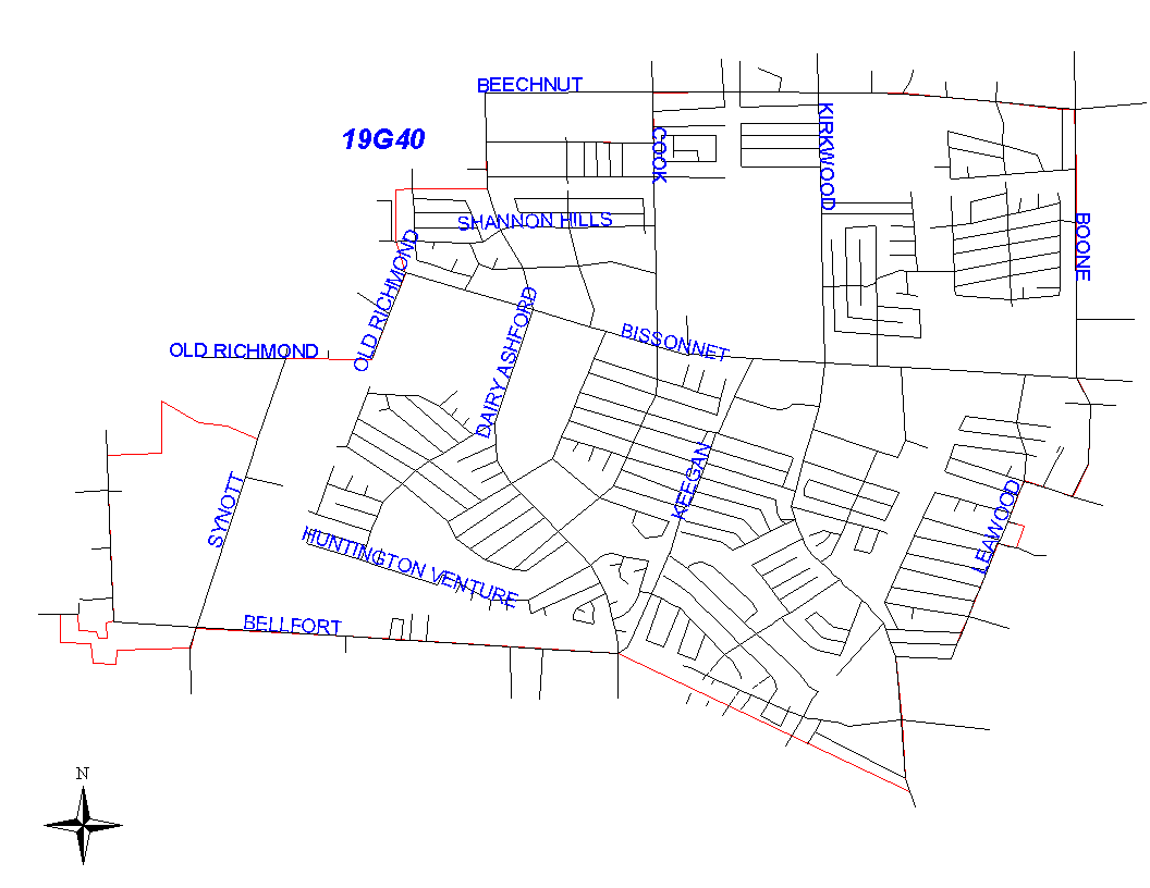 The boundary begins at the intersection of the Houston City Limits that run along Brookwulf and the drainage between Newbrook and Lima. It goes east along the drainage ditch to Dairy Ashford. It turns north on Dairy Ashford to Wellington. Dairy Ashford is the responsibility of 19G30. The boundary turns east along the south lot lines of Wellington to Cook Road. It turns north along the east lot lines of Cook Road to Beechnut. It continues east along the south lot lines of Beechnut to Boone Road. It turns south along the west lot lines of Boone Road to South Drive. It turns west along the south lot lines of South Drive to Leawood. It follows the east lot lines of Leawood south to Brookedge. It follows the south lot lines Brookedge west to South Kirkwood. It turns south on the east lot lines of South Kirkwood and goes to the Houston City Limits along West Bellfort. It follows the city limits west to Belknap. West Bellfort is in 19G40's beat. The beat boundary continues to follow the city limits north to the drainage ditch between Newbrook and Lima, which is where it begins.