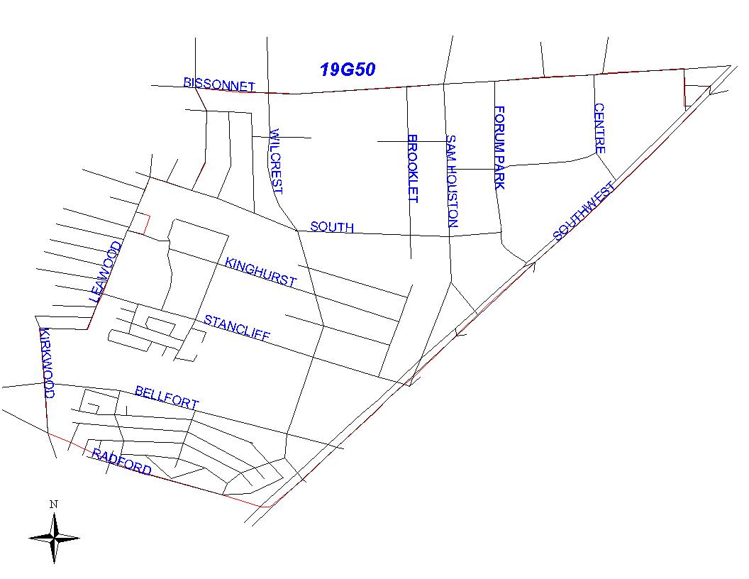 The boundary begins at the intersection of Boone Road and Bissonnet and goes east along the north lot lines of Bissonnet to Plainfield. It turns south along the west lot lines of Plainfield to the Southwest Freeway (I-59.) It continues southwest along the Southwest Freeway to the Houston City Limits. The freeway is the responsibility of 19G50. The beat boundary follows the city limits west to South Kirkwood. It turns north along the east lot lines of South Kirkwood to Brookedge. It turns east on Brookedge to Leawood. It goes north on Leawood to South Drive. It turns east on South Drive to Boone Road. Brookedge, Leawood, and South Drive are all the responsibility of 19G40. The boundary continues north along the west lot lines of Boone Road to Bissonnet, which is where it begins.