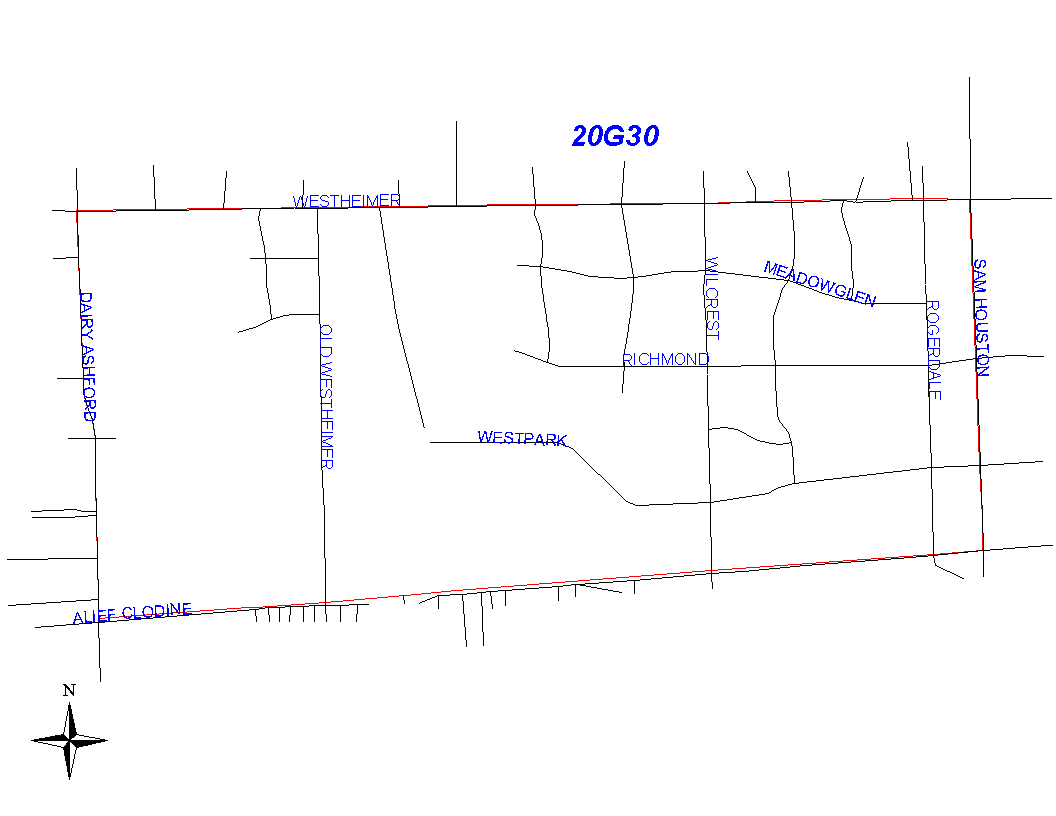 The boundary begins at the intersection of Dairy Ashford and Westheimer and goes east on Westheimner to the West Belt. Westheimer is the responsiblitiy of 20G30. It turns south on the Belt and goes to the SPRR railroad. The Belt will be the responsibility of 20G10's beat. The boundary turns west along the SPRR to Dairy Ashford. It turns north along Dairy Ashford to Westheimer, which is where it begins. Dairy Ashford is the responsibility of 20G30's beat.