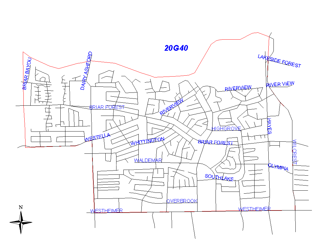 The boundary begins at the Houston City Limits at the Buffalo Bayou on the west side of the city and goes east along the bayou to Wilcrest. It turns south along the west lot lines of Wilcrest and goes to Westheimer. The boundary turns west and follows the north lot lines of Westheimer to Dairy Ashford. At Dairy Ashford, the boundary turns north to West Ella. Dairy Ashford is the responsibility of 20G40's beat. It turns west on West Ella and goes to the Houston city limits. West Ella is the responsibility of 20G40's beat. The boundary turns north along the city limits and goes to the crossing of the Buffalo Bayou, which is where it begins.