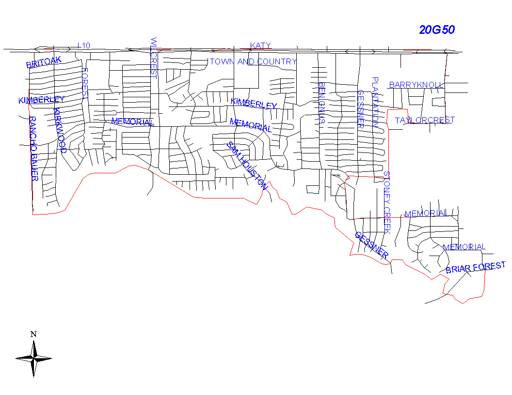 The boundary begins at the intersection of Carlingford and MKT railroad tracks just north of the Katy Freeway (I-10) and goes east on the railroad tracks to the Hedwig City Limits. It turns south along the Hedwig City Limits and continues along the Bunker Hill City Limits and Piney Point City Limits to the Buffalo Bayou. The boundary follows the Bayou west to Rancho Bauer. It turns north on Rancho Bauer and goes to Memorial Drive. It turns east on Memorial Drive to Bateswood. It follows Bateswood to Pertshire. It turns northwest on Pertshire. Pertshire stops at the lot lines behind the corner of Woodthorpe and Carlingford. The boundary follows the west lot lines of Carlingford to the Katy Freeway, which is where it begins.