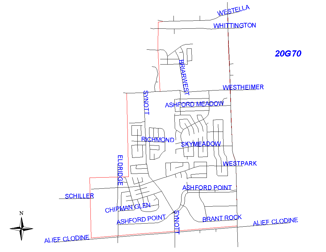 In addition, 20G70 has responsibility for the area around the West Oaks Mall that is within the Houston city limits. It also has responsibility for the Barker Reservoir with the exception of the corner north of Buffalo Bayou and east of Obrien Road. Obrien Road is the responsibility of 20G60.