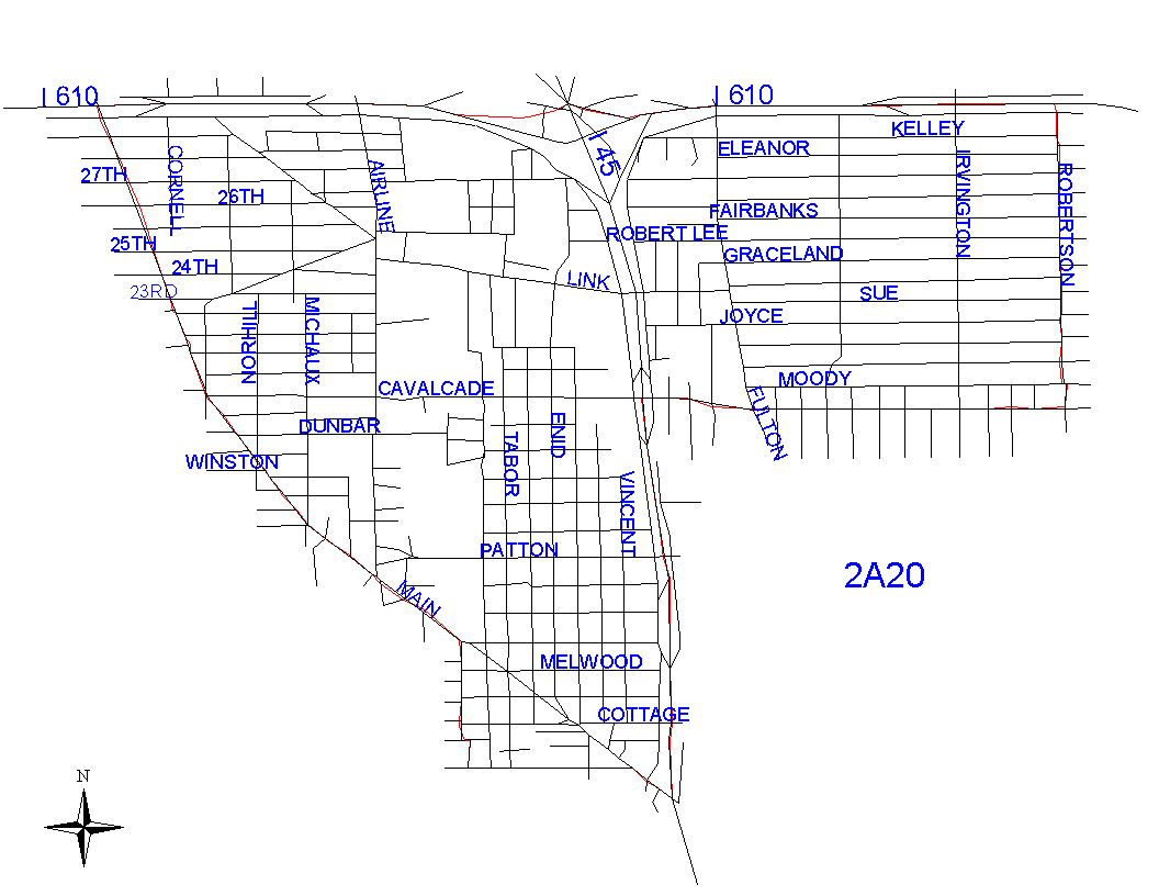 The boundary begins at the intersection of North Main and the 610 Loop North and goes east on the south feeder road of the 610 Loop to Robertson. The Loop is in the jurisdiction of District 3. It turns south at Robertson and goes along the east lot lines of Robertson to Cavalcade. At Calvacade, the boundary turns west along the lot lines on the south side of Cavalcade to I-45. It turns south on I-45 to the intersection with North Main. I-45 is the responsibility of 2A10. The boundary goes northwest on the southwest lot lines of North Main about one block to Pecore and turns west along the south lot lines of Pecore. It continues west on Pecore to Bruce. It takes Bruce north along the west lot lines and continues north on the west lot lines of Moss to North Main. It follows the southwest lot lines of North Main to the 610 Loop where it begins.