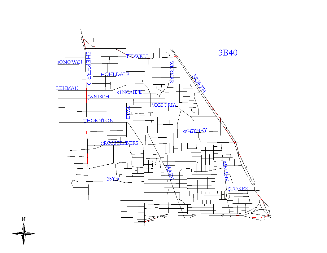 Beginning at the intersection of West Montgomery and Tidwell, the boundary goes east on the south lot lines of tidwell to I-45. It turns south along the west feeder road of I-45 and goes to the North Loop West. It follows the North Loop West to Yale. The Loop is the responsibility of 3B40. At Yale, the boundary turns north along the west lot lines of Yale to the H.B. and T. railroad. It turns west along the tracks to North Shepherd, and follows the west lot lines of North Shepherd to the intersection of West Montgomery. It follows the southern lot lines of West Montgomery to Tidwell, which is where it begins.