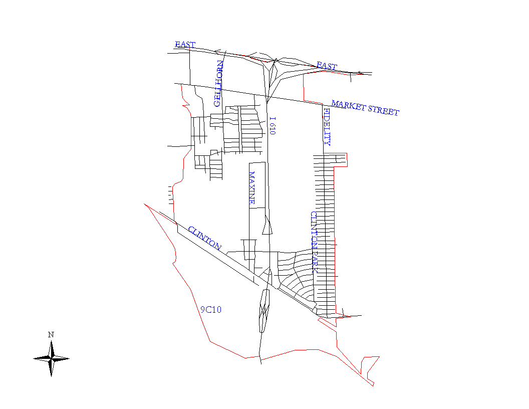The boundary begins at the intersection of Aleen and the East Freeway (I-10) and goes east along the East Freeway to the City Limits of Jacinto City. I-10 is the responsibility of 9C20 and 9C30. The boundary turns south along the city limits, then east to the Galena city limits, and then south again to the Galena Park city limits. The beat boundary follows the city limits south to the Houston Ship Channel. It follows the Ship Channel west to about wharfs 15 and 16. The beat boundary turns northeast, around the grain elevator, across Clinton Drive, and then north at the end of the dead end streets in Port Houston until it intercepts the SPRR railroad tracks. The beat boundary follows the railroad tracks north until they run parallel to Aleen Street and then stop. The boundary continues along the east side of Aleen Street to the East Freeway, which is where it begins.
