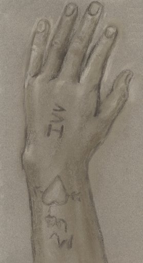 a tattoo of a heart, and on the hand are what appear to be the