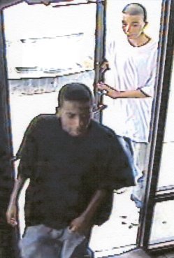 of a suspect in a black shirt, the other is of both suspects entering