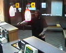Surveillance Photos of Robbery Suspect December 5, 2007 - Houston police robbery investigators are seeking the public’s assistance in identifying one of two suspects photographed by a surveillance camera during a robbery at a Pizza Hut restaurant at 10886 Beechnut about 11:30 p.m. on Saturday (Dec. 1). The suspect is described as a black male between 22 and 24 years of age, about 5 feet 11 inches to 6 feet 1 inch tall and weighing 150 to 170 pounds. He was wearing a black T-shirt with a long-sleeve gray shirt underneath, and was armed with a silver small caliber handgun. The surveillance photos are attached to this news release. A second suspect (not videotaped) is described as a black male, 22 to 24 years of age, about 6 feet 1 inch tall and weighing 150 to 170 pounds. He was last seen wearing a black long sleeve shirt and was also armed with a small caliber handgun. An employee returned from a pizza delivery and was met at the back door (employee entrance) by the two suspects. The suspects pointed their guns at the employee, robbed him of cash and ordered him to open the door. An employee inside the store heard the driver at the back and opened the door. The suspects then pushed the driver inside and continued to rob the restaurant, taking money from the safe and registers. After the robbery, the suspects were seen leaving in an unknown type, black four-door vehicle. Anyone with information on the identity of the photographed suspect or in this case is urged to contact HPD Westside Robbery Division Officer C. Guidry at 281-584-4761 or Crime Stoppers at 713-222-TIPS. GO/JFC 12-5-07 |
