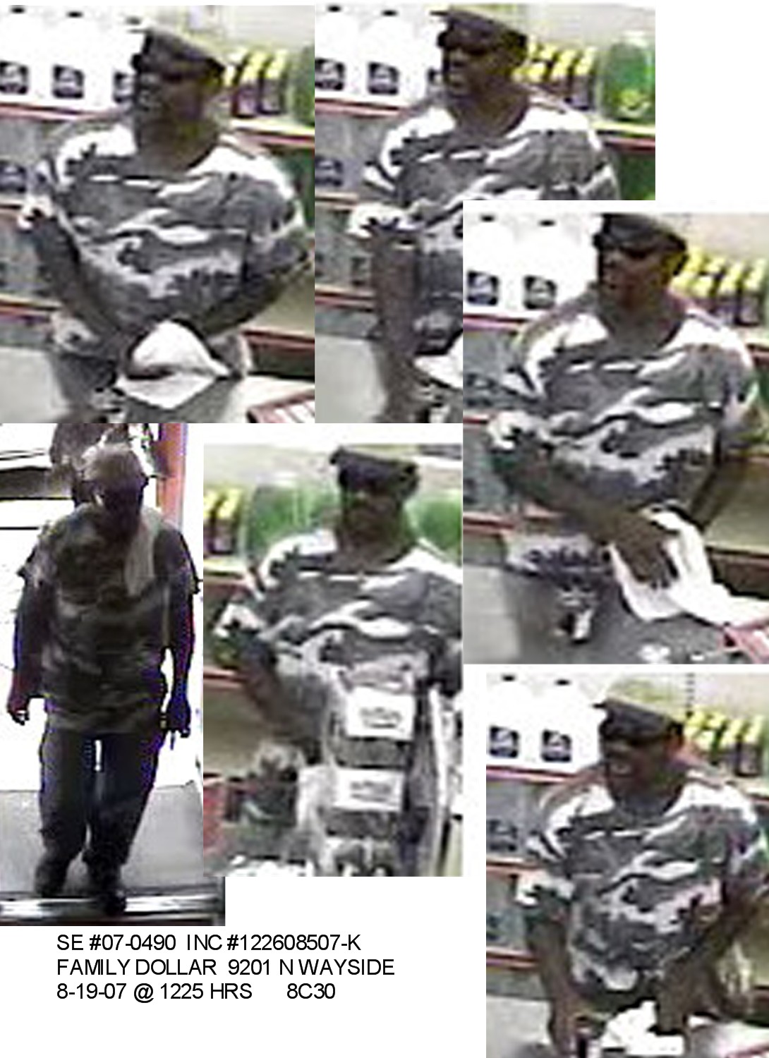 Surveillance Photo of Suspect Wanted in Northeast Robberies Released October 26, 2007 - Investigators with the Houston Police Department Robbery Division is seeking the public’s assistance in identifying a robbery suspect wanted in an incident at the Family Dollar store at 9201 Wayside on August 19, 2007 about 12:25 p.m. The suspect is described as a black male, about 35 to 40 years of age, 6 feet to 6 feet 2 inches tall, with a large build (approximately 200 to 220 pounds). He wears a cap and sunglasses and has a mustache. A surveillance photo of the wanted suspect is attached to this news release. HPD Robbery Division Sergeant J. Rivera reported: On August 19, 2007, the suspect entered the Family dollar and after a short time, approached the counter as if to purchase an item. The suspect threatened the clerk with a knife and demanded the money from the register. The suspect was seen leaving the store on foot. The suspect is believed to be responsible for a series of business robberies in the northeast area of Houston. He has targeted dollar stores, CVS Pharmacies, Subways and Payless Shoe stores throughout Northeast Houston. Friday, July 13 at 9:10 a.m Family Dollar at 9911 Homestead 103426607 JGA/NJM 10-26-07 |