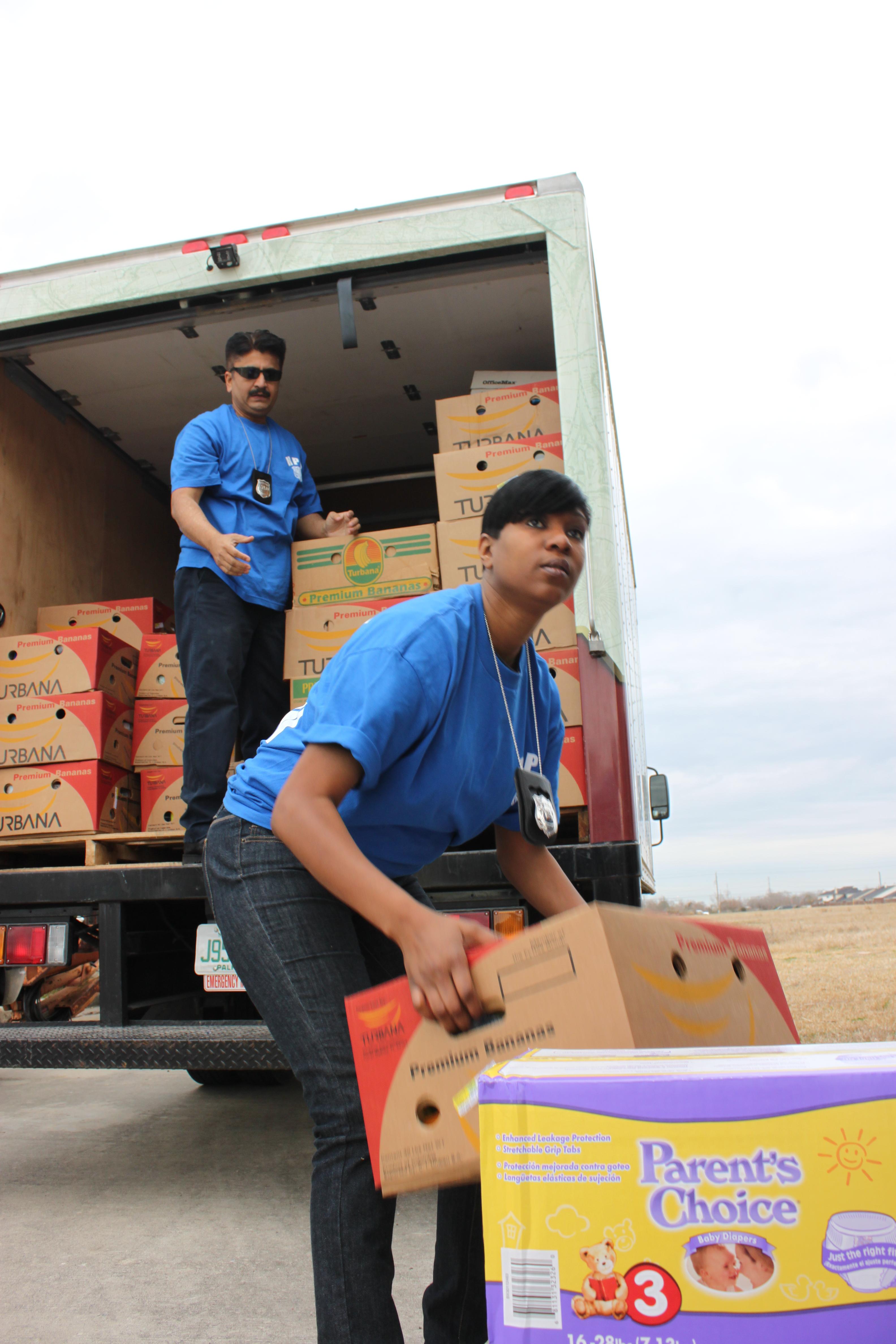 Members of the Houston Police Department, together with the organization “Moms Against Hunger,” teamed up today (Jan. 27) to unload boxes of food, clothing, and baby supplies as part of the department’s Haitian Disaster Relief Effort.