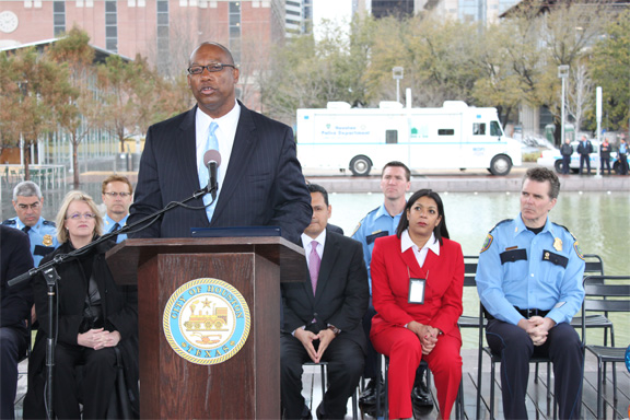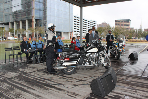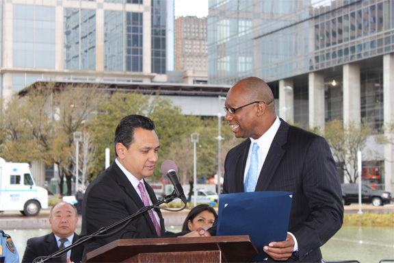HPD Unveils its 26th Annual March on Crime/Lucha Contra El Crimen March 1, 2010 - At a ceremony at Discovery Green in downtown Houston today, Acting Houston Police Chief Charles McClelland unveiled the department’s annual March on Crime initiatives. “HPD addresses crime on a daily basis,” said Chief McClelland. “But, March is the month when we bring special emphasis to certain crimes,” he said. This year, HPD is targeting burglaries of motor vehicles (BMVs) as well as home burglaries, which are some of the most preventable of crimes. “Secure your valuables and do not leave them visible in your vehicle,” Chief McClelland said. “We need the citizens’ help,” he added. Houston City Councilmember, and former HPD Sergeant, Edward Gonzalez agreed. Presenting a City Proclamation to Chief McClelland, Councilmember Gonzalez stressed the partnership between police and citizens. “We encourage each citizen to take an active role in reducing crime in their community,” he said. For more information, visit HPD’s Website at www.houstonpolice.org and click on “March on Crime.” Attached are photos from today's event as well as background information about "March on Crime."