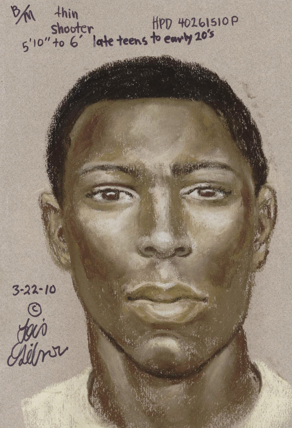 The composite sketch, which is attached, is of the first suspect, the shooter. He is described only as a black male, in his mid-20s, 5 feet 8 inches to 5 feet 11 inches tall, weighing 140 to 160 pounds, with a dark complexion, and matted, bushy hair. He was last seen wearing a white T-shirt and shorts.