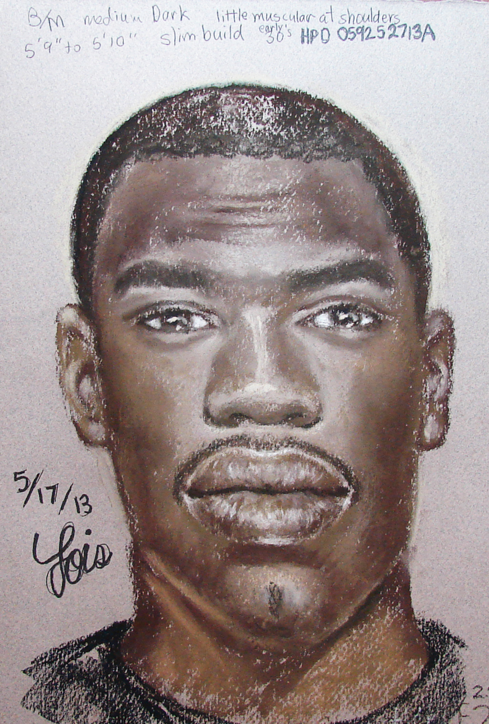 The suspect is described only as a black male in his early 30s. He is about 5 feet 10 inches tall, with a slim build and muscular shoulders, a thin moustache and a goatee. He wore plaid green shorts, a black T-shirt, a blue do-rag and carried a green back pack. A composite sketch of the wanted suspect is attached to this news release.
