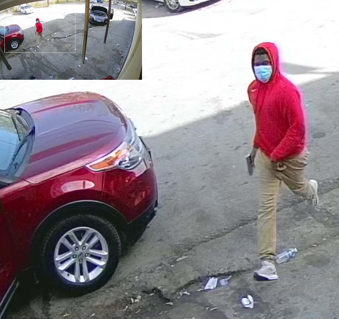 The suspect is described only as a black male wearing a red hoodie and khaki-colored pants.