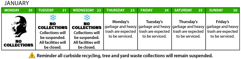 Monday's scheduled garbage routes and heavy trash is expected to be serviced. Reminder that all curbside recycling, tree and yard waste collections will be suspended. All Solid Waste facilities and offices are expected to reopen.